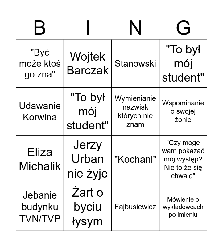 This bingo card has 16 words: Żart o byciu łysym, "Czy mogę wam pokazać mój występ? Nie to że się chwalę", Stanowski, "Być może ktoś go zna", Eliza Michalik, Wojtek Barczak, "Kochani", Fajbusiewicz, Udawanie Korwina, "To był mój student", Jebanie budynku TVN/TVP, "To był mój student", Jerzy Urban nie żyje, Wspominanie o swojej żonie, Wymienianie nazwisk których nie znam and Mówienie o wykładowcach po imieniu.