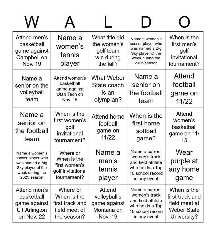 This bingo card has a free space and 56 words: Attend football’s game against NAU on Nov. 22, Attend men’s basketball game against UT Arlington on Nov. 22, Attend volleyball’s game against Montana St. on Nov. 21, Attend men’s basketball game against Campbell on Nov. 19, Attend volleyball’s game against Montana on Nov. 19, Attend women’s basketball game against UC Davis on Nov. 12, Attend women’s basketball game against Utah Tech on Nov. 15, Name a senior on the volleyball team, Name a senior on the football team, Name a XC athlete who competed at the NCAA Mountain Region Championships, Name a women’s soccer player who was named a Big Sky player of the week during the 2025 season, Name a women’s tennis player, Name a men’s tennis player, What was the final score of the women's basketball game against Utah Valley on Nov. 20?, What was the final score of the volleyball game against NAU on Nov. 13?, What was the final score of the football game against Idaho State on Nov. 15?, When is the first men’s golf invitational tournament?, When is the first women’s golf invitational tournament?, When is the first track and field meet of the season?, When is the first track and field meet at Weber State University?, When is the first home softball game?, Name a current women’s track and field athlete who holds a Top 10 school record in any event, Name a current women’s track and field athlete who holds a Top 10 school record in any event, What title did the women’s golf team win during the fall?, What team won a Big Sky Championship in the 2024-25 school year?, What Weber State coach is an olympian?, Wear purple at any home game, Bring a sign to any home game and cheer loud for the Wildcats!, Attend football game on 11/22, Attend men’s basketball game on 11/22, Attend volleyball game on 11/21, Attend men’s basketball game on 11/19, Attend volleyball game on 11/19, Attend women’s basketball game 11/12, Attend women’s basketball game on 11/ 15, Name a senior on the volleyball team, Name a senior on the football team, Name a XC athlete who competed at the NCAA Mountain Region Championships, Name a women’s soccer player who was named a Big Sky player of the week during the 2025 season, Name a women’s tennis player, Name a men’s tennis player, What was the final score of the women's basketball game against Utah Valley on Nov. 20?, What was the final score of the volleyball game against NAU on Nov. 13?, What was the final score of the football game against Idaho State on Nov. 15?, Where or When is the first men’s golf invitational tournament?, Where or When is the first women’s golf invitational tournament?, Where or When is the first track and field meet of the season?, When is the first track and field meet at Weber State University?, When is the first home softball game?, Name a current women’s track and field athlete who holds a Top 10 school record in any event, Name a current women’s track and field athlete who holds a Top 10 school record in any event, What title did the women’s golf team win during the fall?, What team won a Big Sky Championship in the 2024-25 school year?, What Weber State coach is an olympian?, Wear purple at any home game and Bring a sign to any home game and cheer loud for the Wildcats!.