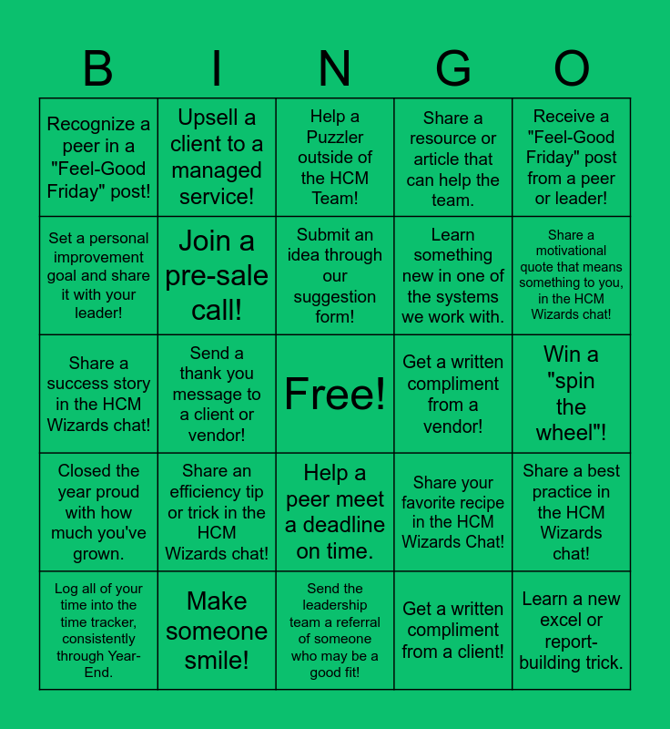 This bingo card has a free space and 24 words: Share an efficiency tip or trick in the HCM Wizards chat!, Make someone smile!, Submit an idea through our suggestion form!, Log all of your time into the time tracker, consistently through Year-End., Receive a "Feel-Good Friday" post from a peer or leader!, Recognize a peer in a "Feel-Good Friday" post!, Set a personal improvement goal and share it with your leader!, Upsell a client to a managed service!, Get a written compliment from a vendor!, Help a peer meet a deadline on time., Learn something new in one of the systems we work with., Share a success story in the HCM Wizards chat!, Share your favorite recipe in the HCM Wizards Chat!, Share a best practice in the HCM Wizards chat!, Join a pre-sale call!, Get a written compliment from a client!, Win a "spin the wheel"!, Help a Puzzler outside of the HCM Team!, Share a motivational quote that means something to you, in the HCM Wizards chat!, Send a thank you message to a client or vendor!, Learn a new excel or report-building trick., Closed the year proud with how much you've grown., Share a resource or article that can help the team. and Send the leadership team a referral of someone who may be a good fit!.