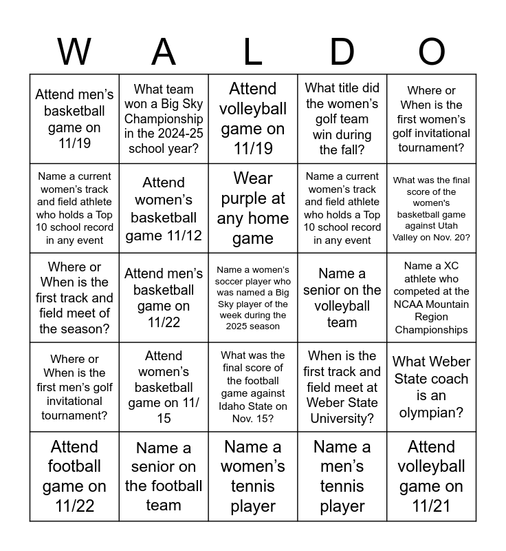This bingo card has 29 words: Attend football game on 11/22, Attend football game on 11/22, Attend men’s basketball game on 11/22, Attend volleyball game on 11/21, Attend men’s basketball game on 11/19, Attend volleyball game on 11/19, Attend women’s basketball game 11/12, Attend women’s basketball game on 11/ 15, Name a senior on the volleyball team, Name a senior on the football team, Name a XC athlete who competed at the NCAA Mountain Region Championships, Name a women’s soccer player who was named a Big Sky player of the week during the 2025 season, Name a women’s tennis player, Name a men’s tennis player, What was the final score of the women's basketball game against Utah Valley on Nov. 20?, What was the final score of the volleyball game against NAU on Nov. 13?, What was the final score of the football game against Idaho State on Nov. 15?, Where or When is the first men’s golf invitational tournament?, Where or When is the first women’s golf invitational tournament?, Where or When is the first track and field meet of the season?, When is the first track and field meet at Weber State University?, When is the first home softball game?, Name a current women’s track and field athlete who holds a Top 10 school record in any event, Name a current women’s track and field athlete who holds a Top 10 school record in any event, What title did the women’s golf team win during the fall?, What team won a Big Sky Championship in the 2024-25 school year?, What Weber State coach is an olympian?, Wear purple at any home game and Bring a sign to any home game and cheer loud for the Wildcats!.