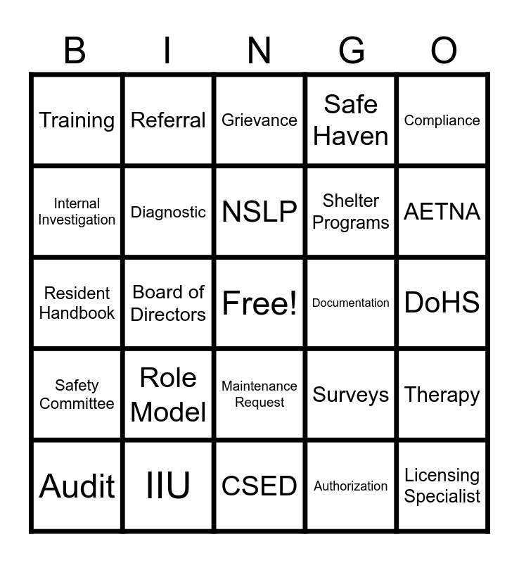 This bingo card has a free space and 29 words: Audit, Incident Report, Board of Directors, Employee Handbook, Training, Grievance, Diagnostic, Role Model, Documentation, IIU, DoHS, Licensing Specialist, CSED, Authorization, AETNA, Mobile Crisis, Maintenance Request, Safety Committee, Compliance, Resident Handbook, Surveys, Foster Care, Shelter Programs, Internal Investigation, Safe Haven, Referral, Therapy, NSLP and AMAP.