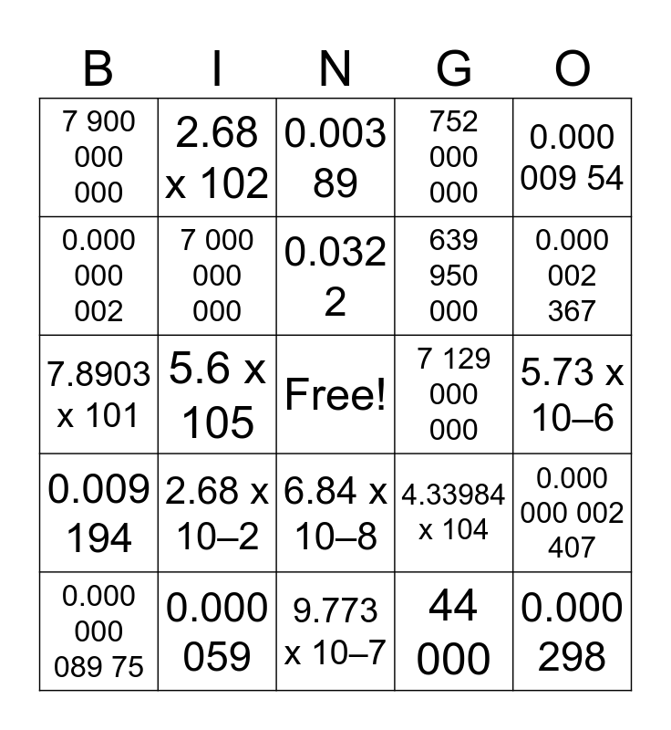 This bingo card has a free space and 59 words: 0.000 000 991, 0.000 059, 0.000 986 73, 0.009 194, 44 000, 3 680 000, 7 000 000 000, 200 000, 639 950 000, 0.000 000 438, 752 000 000, 0.000 296 5, 0.000 000 002, 0.000 008 37, 47 930 000, 7 900 000 000, 0.000 298, 0.000 009 54, 0.000 000 047 795, 0.032 2, 7 129 000 000, 0.003 89, 0.000 000 089 75, 0.000 000 002 407, 2 400 000, 0.000 045 6, 0.000 02, 900 900 000, 0.000 002 367, 2.71 x 109, 2.1 x 107, 5.6 x 10–5, 4.4 x 10–9, 4.4296 x 103, 2.68 x 102, 5.73 x 106, 2.1 x 10–7, 5.6 x 105, 4.4 x 109, 7.8903 x 101, 4.4296 x 10–3, 2.68 x 10–2, 5.73 x 10–6, 2.71 x 10–7, 9.6866 x 102, 3.867 x 10–5, 5.2 x 109, 1.088 x 10–4, 6.84 x 10–8, 9.773 x 10–7, 9.6866 x 10–2, 3.867 x 105, 4.5 x 10–1, 7.9947 x 106, 5.2 x 10–9, 4.33984 x 104, 6.84 x 108, 9.773 x 107 and 2.24749 x 104.