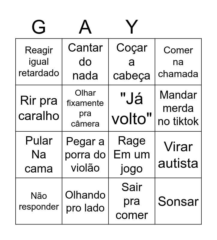This bingo card has 16 words: Olhando pro lado, Virar autista, Coçar a cabeça, Reagir igual retardado, Pular Na cama, Cantar do nada, Rage Em um jogo, Sair pra comer, Rir pra caralho, Olhar fixamente pra câmera, Não responder, Comer na chamada, Pegar a porra do violão, Mandar merda no tiktok, "Já volto" and Sonsar.