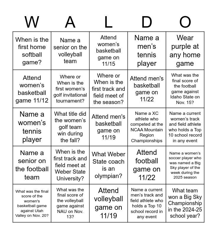 This bingo card has a free space and 27 words: Attend football game on 11/22, Attend volleyball game on 11/21, Attend men's basketball game on 11/22, Attend volleyball game on 11/19, Attend women’s basketball game 11/12, Attend women’s basketball game on 11/15, Name a senior on the volleyball team, Name a senior on the football team, Name a XC athlete who competed at the NCAA Mountain Region Championships, Name a women’s soccer player who was named a Big Sky player of the week during the 2025 season, Name a women’s tennis player, Name a men’s tennis player, What was the final score of the women's basketball game against Utah Valley on Nov. 20?, What was the final score of the volleyball game against NAU on Nov. 13?, What was the final score of the football game against Idaho State on Nov. 15?, Where or When is the first men’s golf invitational tournament?, Where or When is the first women’s golf invitational tournament?, Where or When is the first track and field meet of the season?, When is the first track and field meet at Weber State University?, When is the first home softball game?, Name a current women’s track and field athlete who holds a Top 10 school record in any event, Name a current men’s track and field athlete who holds a Top 10 school record in any event, What title did the women’s golf team win during the fall?, What team won a Big Sky Championship in the 2024-25 school year?, What Weber State coach is an olympian?, Wear purple at any home game and Bring a sign to any home game and cheer loud for the Wildcats!.