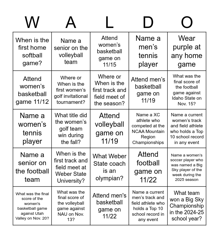 This bingo card has a free space and 27 words: Attend football game on 11/22, Attend volleyball game on 11/21, Attend men’s basketball game on 11/19, Attend men's basketball game on 11/22, Attend women’s basketball game 11/12, Attend women’s basketball game on 11/15, Name a senior on the volleyball team, Name a senior on the football team, Name a XC athlete who competed at the NCAA Mountain Region Championships, Name a women’s soccer player who was named a Big Sky player of the week during the 2025 season, Name a women’s tennis player, Name a men’s tennis player, What was the final score of the women's basketball game against Utah Valley on Nov. 20?, What was the final score of the volleyball game against NAU on Nov. 13?, What was the final score of the football game against Idaho State on Nov. 15?, Where or When is the first men’s golf invitational tournament?, Where or When is the first women’s golf invitational tournament?, Where or When is the first track and field meet of the season?, When is the first track and field meet at Weber State University?, When is the first home softball game?, Name a current women’s track and field athlete who holds a Top 10 school record in any event, Name a current men’s track and field athlete who holds a Top 10 school record in any event, What title did the women’s golf team win during the fall?, What team won a Big Sky Championship in the 2024-25 school year?, What Weber State coach is an olympian?, Wear purple at any home game and Bring a sign to any home game and cheer loud for the Wildcats!.