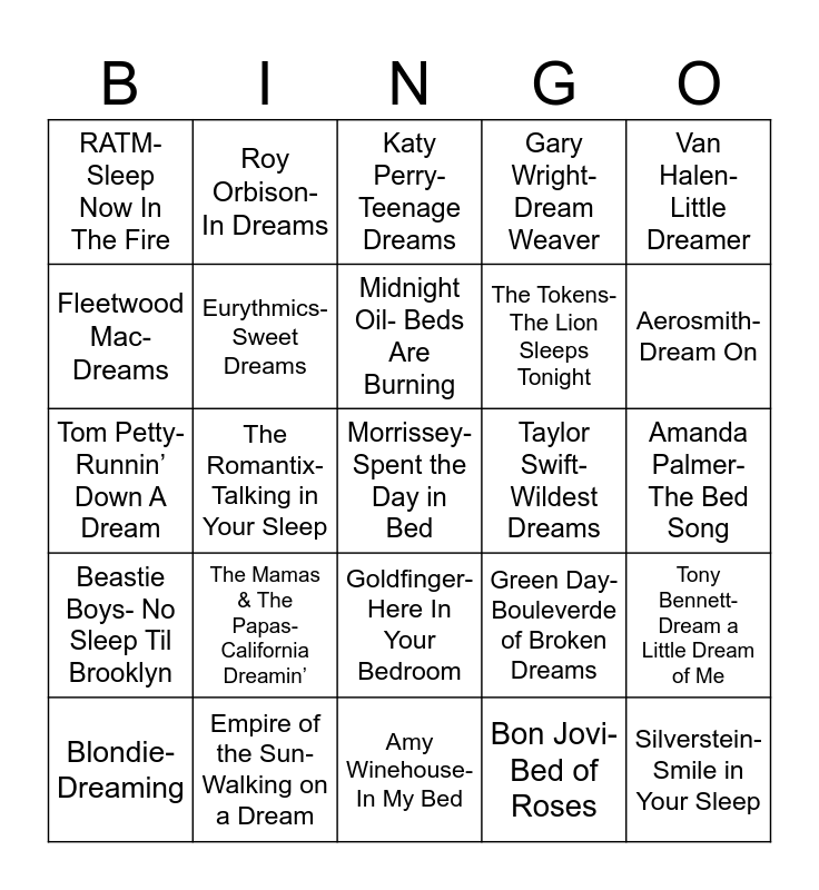 This bingo card has 29 words: Blondie- Dreaming, Nirvana- Where Did You Sleep Last Night, The Romantix- Talking in Your Sleep, Silverstein- Smile in Your Sleep, RATM- Sleep Now In The Fire, Katy Perry- Teenage Dreams, Eurythmics- Sweet Dreams, The Mamas & The Papas- California Dreamin’, Taylor Swift- Wildest Dreams, Empire of the Sun- Walking on a Dream, Amanda Palmer- The Bed Song, Morrissey- Spent the Day in Bed, Amy Winehouse- In My Bed, Bon Jovi- Bed of Roses, Aerosmith- Dream On, Metallica- Enter Sandman, Goldfinger- Here In Your Bedroom, Beastie Boys- No Sleep Til Brooklyn, Van Halen- Little Dreamer, Tom Petty- Runnin’ Down A Dream, Green Day- Bouleverde of Broken Dreams, The Cranberries- Dreams, The Tokens- The Lion Sleeps Tonight, Fleetwood Mac- Dreams, Gary Wright- Dream Weaver, Roy Orbison- In Dreams, Tony Bennett- Dream a Little Dream of Me, Midnight Oil- Beds Are Burning and Weezer- Only In Dreams.