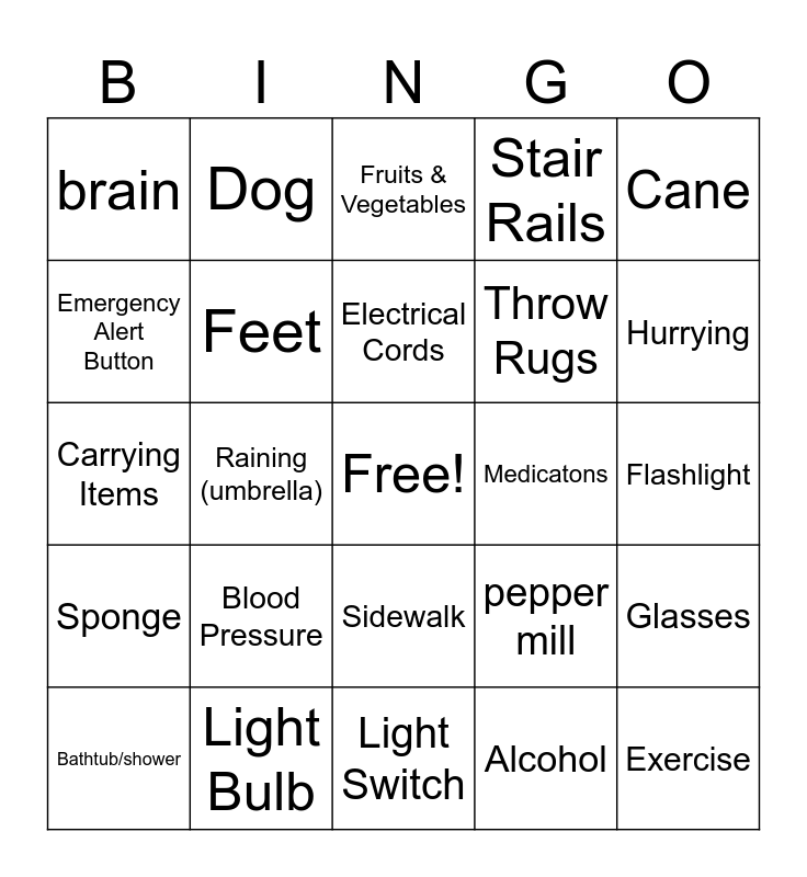 This bingo card has a free space and 24 words: Bathtub/shower, Blood Pressure, Electrical Cords, Alcohol, Cane, brain, Dog, Fruits & Vegetables, Medicatons, Flashlight, Carrying Items, Feet, pepper mill, Glasses, Emergency Alert Button, Light Bulb, Light Switch, Stair Rails, Hurrying, Sponge, Raining (umbrella), Sidewalk, Throw Rugs and Exercise.