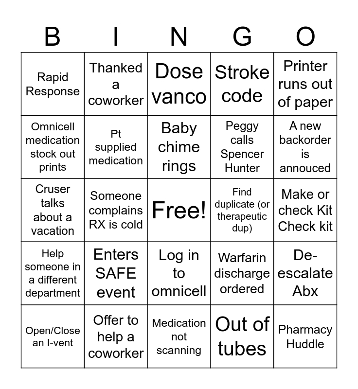 This bingo card has a free space and 37 words: Missing meds - Pt transferred, RN can't find meds in fridge, Temp trak alarm goes off, Pt supplied medication, De-escalate Abx, Enters SAFE event, Baby chime rings, Complete a med rec, Printer runs out of paper, Tube station is down, Someone complains RX is cold, Stroke code, Pharmacy Huddle, Make or check Kit Check kit, Omnicell medication stock out prints, Help someone in a different department, RN asks to have medication verified, Dose vanco, Log in to omnicell, Find duplicate (or therapeutic dup), Rapid Response, A new backorder is annouced, Open/Close an I-vent, Medication not scanning, Question about IV compatibility, Out of tubes, Thanked a coworker, Hear someone mispronounce medication, Was told "happy pharmacy week" from non-Rx staff, Changed into hospital scrubs, Campus assessment paged, Offer to help a coworker, Cruser talks about a vacation, Eat a treat from the breakroom, Warfarin discharge ordered, Peggy calls Spencer Hunter and Answers the pharmacy phone in under 2 rings.