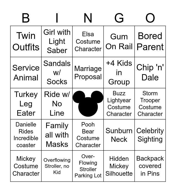 This bingo card has a free space and 24 words: Family all with Masks, Overflowing Stroller, no Kid, Marriage Proposal, Mickey Costume Character, Bored Parent, Twin Outfits, Service Animal, Girl with Light Saber, Buzz Lightyear Costume Character, Pooh Bear Costume Character, +4 Kids in Group, Turkey Leg Eater, Sunburn Neck, Celebrity Sighting, Sandals w/ Socks, Hidden Mickey Silhouette, Storm Trooper Costume Character, Elsa Costume Character, Chip 'n' Dale, Ride w/ No Line, Backpack covered in Pins, Danielle Rides Incredible coaster, Gum On Rail and Over-Flowing Stroller Parking Lot.