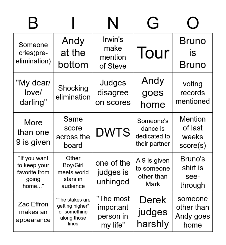 This bingo card has a free space and 24 words: Zac Effron makes an appearance, Other Boy/Girl meets world stars in audience, Judges disagree on scores, Derek judges harshly, Bruno is Bruno, Someone cries(pre-elimination), Andy at the bottom, Irwin's make mention of Steve, Someone's dance is dedicated to their partner, Mention of last weeks score(s), More than one 9 is given, Shocking elimination, A 9 is given to someone other than Mark, Bruno's shirt is see-through, "My dear/ love/ darling", "The stakes are getting higher" or something along those lines, "The most important person in my life", Tour, voting records mentioned, "If you want to keep your favorite from going home...", Same score across the board, one of the judges is unhinged, Andy goes home and someone other than Andy goes home.