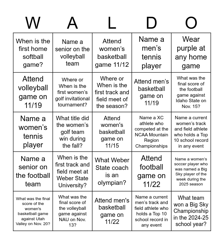 This bingo card has a free space and 27 words: Attend football game on 11/22, Attend volleyball game on 11/21, Attend men’s basketball game on 11/19, Attend men's basketball game on 11/22, Attend volleyball game on 11/19, Attend women’s basketball game 11/12, Name a senior on the volleyball team, Name a senior on the football team, Name a XC athlete who competed at the NCAA Mountain Region Championships, Name a women’s soccer player who was named a Big Sky player of the week during the 2025 season, Name a women’s tennis player, Name a men’s tennis player, What was the final score of the women's basketball game against Utah Valley on Nov. 20?, What was the final score of the volleyball game against NAU on Nov. 13?, What was the final score of the football game against Idaho State on Nov. 15?, Where or When is the first men’s golf invitational tournament?, Where or When is the first women’s golf invitational tournament?, Where or When is the first track and field meet of the season?, When is the first track and field meet at Weber State University?, When is the first home softball game?, Name a current women’s track and field athlete who holds a Top 10 school record in any event, Name a current men’s track and field athlete who holds a Top 10 school record in any event, What title did the women’s golf team win during the fall?, What team won a Big Sky Championship in the 2024-25 school year?, What Weber State coach is an olympian?, Wear purple at any home game and Bring a sign to any home game and cheer loud for the Wildcats!.