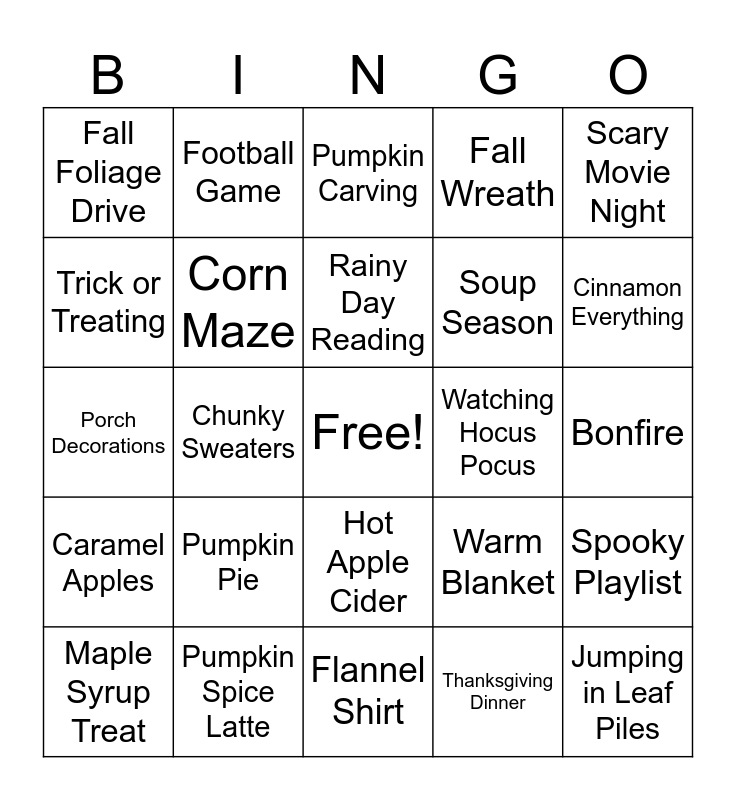This bingo card has a free space and 30 words: Pumpkin Spice Latte, Apple Picking, Chunky Sweaters, Cozy Socks, Fall Foliage Drive, Pumpkin Carving, Corn Maze, Hot Apple Cider, Watching Hocus Pocus, Flannel Shirt, Bonfire, Jumping in Leaf Piles, Thanksgiving Dinner, Hayride, Cinnamon Everything, Halloween Costume, Warm Blanket, Caramel Apples, Pumpkin Pie, Scary Movie Night, Porch Decorations, Fall Scented Candle, Football Game, Soup Season, Trick or Treating, Fall Wreath, Spooky Playlist, Maple Syrup Treat, Rainy Day Reading and Knitting or Crocheting.