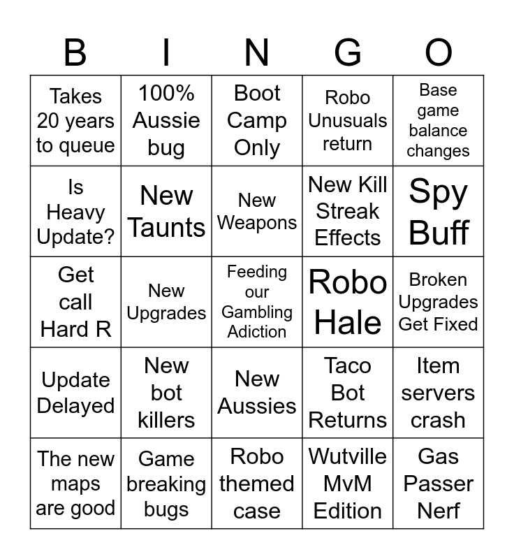 This bingo card has a free space and 24 words: New bot killers, Game breaking bugs, New Weapons, The new maps are good, Base game balance changes, Takes 20 years to queue, Is Heavy Update?, 100% Aussie bug, Robo Hale, New Aussies, New Kill Streak Effects, Get call Hard R, Taco Bot Returns, Item servers crash, New Taunts, Wutville MvM Edition, Broken Upgrades Get Fixed, Boot Camp Only, Spy Buff, New Upgrades, Gas Passer Nerf, Update Delayed, Robo Unusuals return and Robo themed case.