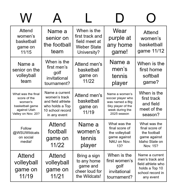 This bingo card has a free space and 24 words: Attend football game on 11/22, Attend volleyball game on 11/21, Attend men's basketball game on 11/22, Attend volleyball game on 11/19, Attend women’s basketball game 11/12, Attend women’s basketball game on 11/15, Name a senior on the volleyball team, Name a senior on the football team, Name a women’s soccer player who was named a Big Sky player of the week during the 2025 season, Name a women’s tennis player, Name a men’s tennis player, What was the final score of the women's basketball game against Utah Valley on Nov. 20?, What was the final score of the volleyball game against NAU on Nov. 13?, What was the final score of the football game against Idaho State on Nov. 15?, When is the first men’s golf invitational tournament?, When is the first women’s golf invitational tournament?, When is the first track and field meet of the season?, When is the first track and field meet at Weber State University?, When is the first home softball game?, Name a current women’s track and field athlete who holds a Top 10 school record in any event, Name a current men’s track and field athlete who holds a Top 10 school record in any event, Follow @WSUWildcats on social media!, Wear purple at any home game! and Bring a sign to any home game and cheer loud for the Wildcats!.