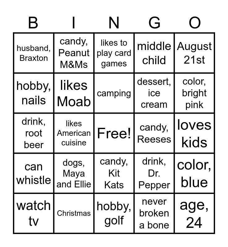 This bingo card has a free space and 24 words: dogs, Maya and Ellie, Christmas, camping, watch tv, August 21st, husband, Braxton, hobby, nails, candy, Peanut M&Ms, candy, Reeses, candy, Kit Kats, dessert, ice cream, drink, root beer, drink, Dr. Pepper, color, blue, likes Moab, never broken a bone, loves kids, likes to play card games, color, bright pink, likes American cuisine, age, 24, can whistle, middle child and hobby, golf.