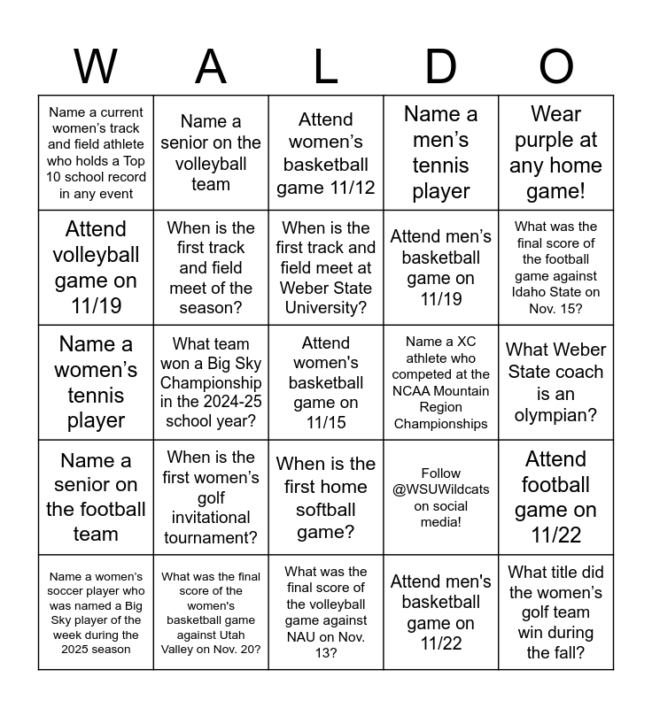 This bingo card has a free space and 28 words: Attend football game on 11/22, Attend volleyball game on 11/21, Attend men’s basketball game on 11/19, Attend men's basketball game on 11/22, Attend volleyball game on 11/19, Attend women’s basketball game 11/12, Name a senior on the volleyball team, Name a senior on the football team, Name a XC athlete who competed at the NCAA Mountain Region Championships, Name a women’s soccer player who was named a Big Sky player of the week during the 2025 season, Name a women’s tennis player, Name a men’s tennis player, What was the final score of the women's basketball game against Utah Valley on Nov. 20?, What was the final score of the volleyball game against NAU on Nov. 13?, What was the final score of the football game against Idaho State on Nov. 15?, When is the first men’s golf invitational tournament?, When is the first women’s golf invitational tournament?, When is the first track and field meet of the season?, When is the first track and field meet at Weber State University?, When is the first home softball game?, Name a current women’s track and field athlete who holds a Top 10 school record in any event, Name a current men’s track and field athlete who holds a Top 10 school record in any event, What title did the women’s golf team win during the fall?, What team won a Big Sky Championship in the 2024-25 school year?, What Weber State coach is an olympian?, Follow @WSUWildcats on social media!, Wear purple at any home game! and Bring a sign to any home game and cheer loud for the Wildcats!.
