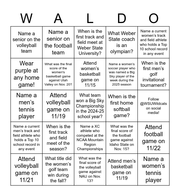 This bingo card has 27 words: Attend football game on 11/22, Attend volleyball game on 11/21, Attend women’s basketball game on 11/15, Attend men’s basketball game on 11/19, Attend volleyball game on 11/19, Name a senior on the volleyball team, Name a senior on the football team, Name a XC athlete who competed at the NCAA Mountain Region Championships, Name a women’s soccer player who was named a Big Sky player of the week during the 2025 season, Name a women’s tennis player, Name a men’s tennis player, What was the final score of the women's basketball game against Utah Valley on Nov. 20?, What was the final score of the volleyball game against NAU on Nov. 13?, What was the final score of the football game against Idaho State on Nov. 15?, When is the first men’s golf invitational tournament?, When is the first women’s golf invitational tournament?, When is the first track and field meet of the season?, When is the first track and field meet at Weber State University?, When is the first home softball game?, Name a current women’s track and field athlete who holds a Top 10 school record in any event, Name a current men’s track and field athlete who holds a Top 10 school record in any event, What title did the women’s golf team win during the fall?, What team won a Big Sky Championship in the 2024-25 school year?, What Weber State coach is an olympian?, Follow @WSUWildcats on social media!, Wear purple at any home game! and Bring a sign to any home game and cheer loud for the Wildcats!.