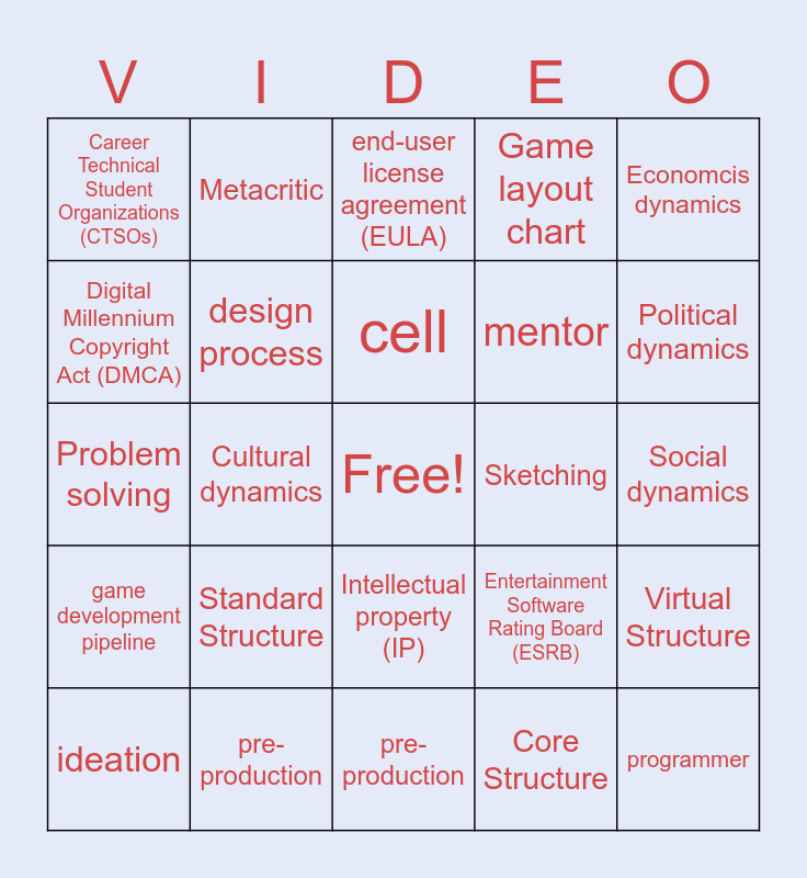 This bingo card has a free space and 42 words: PERT chart, cell, Gantt chart, Standard Structure, Core Structure, Virtual Structure, programmer, non-disclosure agreement (NDA), end-user license agreement (EULA), Intellectual property (IP), Social dynamics, Political dynamics, Cultural dynamics, Economcis dynamics, Technology dynamics, Entertainment Software Rating Board (ESRB), randomness, Problem solving, Kickstarter, Metacritic, Digital Millennium Copyright Act (DMCA), professionalism, professional presentation, Career Technical Student Organizations (CTSOs), extracurricular, Work-based learning, mentor, conflict resolution, constructive criticism, security policy, Cybersecurity, game development pipeline, design process, pre-production, Brainstorming, ideation, pre-production, Sketching, Storyboarding, game design document (GDD), Game layout chart and beat chart.