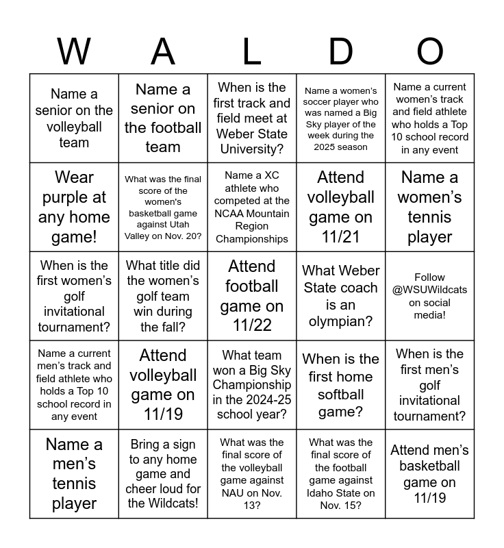 This bingo card has a free space and 26 words: Attend volleyball game on 11/19, Attend men’s basketball game on 11/19, Attend volleyball game on 11/21, Attend women’s basketball game on 11/15, Name a senior on the volleyball team, Name a senior on the football team, Name a XC athlete who competed at the NCAA Mountain Region Championships, Name a women’s soccer player who was named a Big Sky player of the week during the 2025 season, Name a women’s tennis player, Name a men’s tennis player, What was the final score of the women's basketball game against Utah Valley on Nov. 20?, What was the final score of the volleyball game against NAU on Nov. 13?, What was the final score of the football game against Idaho State on Nov. 15?, When is the first men’s golf invitational tournament?, When is the first women’s golf invitational tournament?, When is the first track and field meet of the season?, When is the first track and field meet at Weber State University?, When is the first home softball game?, Name a current women’s track and field athlete who holds a Top 10 school record in any event, Name a current men’s track and field athlete who holds a Top 10 school record in any event, What title did the women’s golf team win during the fall?, What team won a Big Sky Championship in the 2024-25 school year?, What Weber State coach is an olympian?, Follow @WSUWildcats on social media!, Wear purple at any home game! and Bring a sign to any home game and cheer loud for the Wildcats!.