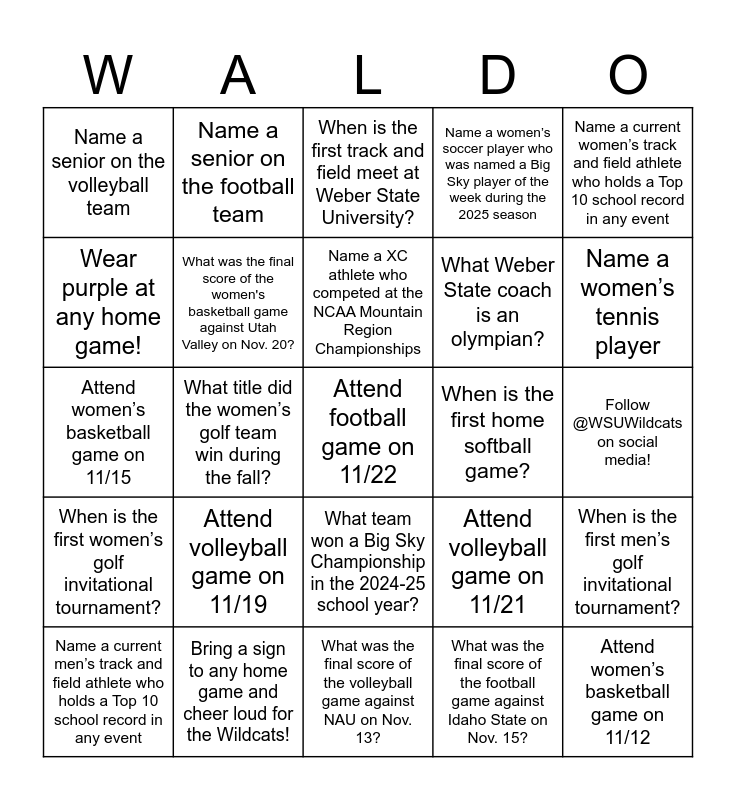 This bingo card has a free space and 26 words: Attend volleyball game on 11/21, Attend volleyball game on 11/19, Attend women’s basketball game on 11/15, Attend women’s basketball game on 11/12, Name a senior on the volleyball team, Name a senior on the football team, Name a XC athlete who competed at the NCAA Mountain Region Championships, Name a women’s soccer player who was named a Big Sky player of the week during the 2025 season, Name a women’s tennis player, Name a men’s tennis player, What was the final score of the women's basketball game against Utah Valley on Nov. 20?, What was the final score of the volleyball game against NAU on Nov. 13?, What was the final score of the football game against Idaho State on Nov. 15?, When is the first men’s golf invitational tournament?, When is the first women’s golf invitational tournament?, When is the first track and field meet of the season?, When is the first track and field meet at Weber State University?, When is the first home softball game?, Name a current women’s track and field athlete who holds a Top 10 school record in any event, Name a current men’s track and field athlete who holds a Top 10 school record in any event, What title did the women’s golf team win during the fall?, What team won a Big Sky Championship in the 2024-25 school year?, What Weber State coach is an olympian?, Follow @WSUWildcats on social media!, Wear purple at any home game! and Bring a sign to any home game and cheer loud for the Wildcats!.