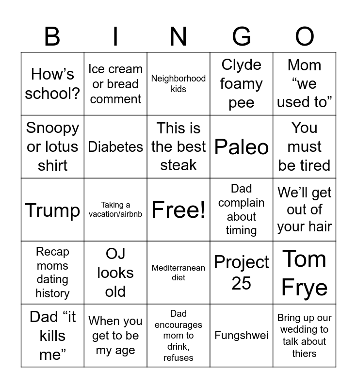This bingo card has a free space and 24 words: OJ looks old, When you get to be my age, This is the best steak, Dad “it kills me”, Mom “we used to”, How’s school?, Snoopy or lotus shirt, Ice cream or bread comment, Dad complain about timing, Mediterranean diet, Paleo, Trump, Project 25, Tom Frye, Diabetes, Fungshwei, We’ll get out of your hair, Neighborhood kids, You must be tired, Taking a vacation/airbnb, Bring up our wedding to talk about thiers, Recap moms dating history, Clyde foamy pee and Dad encourages mom to drink, refuses.