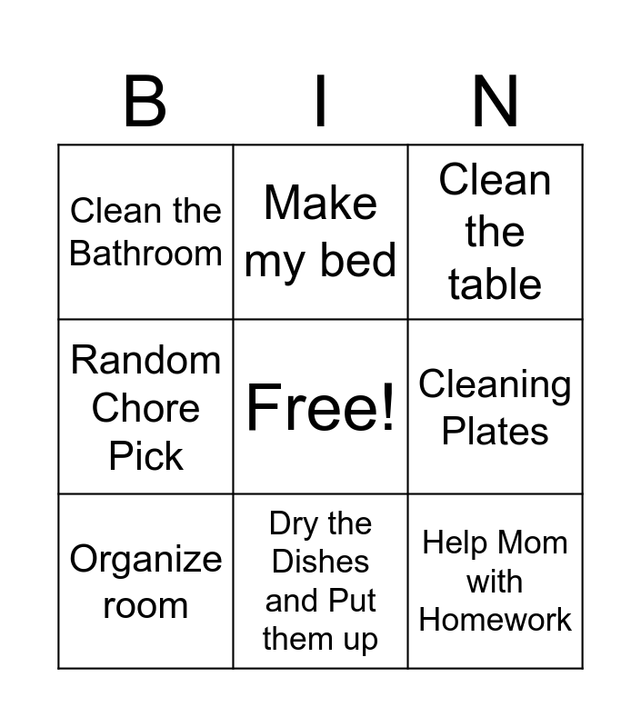 This bingo card has a free space and 8 words: Cleaning Plates, Clean the table, Make my bed, Organize room, Clean the Bathroom, Help Mom with Homework, Random Chore Pick and Dry the Dishes and Put them up.