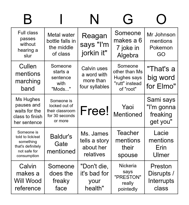 This bingo card has a free space and 39 words: Mr Johnson goes on a side tangent 30 seconds or longer, Yuri mentioned, Ms Hughes says "Right, yes?", Someone starts a sentence with "Mods...", Calvin makes a Will Wood reference, Ms. James tells a story about her relatives, Calvin uses a word with more than four syllables, "Wench", Mr Johnson mentions Pokemon GO, Someone is told to lick/eat something that's definitely not safe for consumption, Someone is locked out of their classroom for 30 seconds or more, Someone makes a 6 7 joke in Algebra, Preston Disrupts / Interrupts class, Sami says "I'm gonna freaking get you", Yaoi Mentioned, Baldur's Gate mentioned, Ms Waymer says "We're like Goldilocks", Full class passes without hearing a slur, Hailey mentions birds, Teacher mentions their spouse, Cullen mentions marching band, "Don't die, it's bad for your health", Someone other than Ms Hughes says "rutt" instead of "root", "That's a big word for Elmo", Someone threatens to skin someone else, Meghan makes an Alien Stage reference, The word "Autism" is dropped more than once in two minutes, Someone makes a scissoring joke, Cullen says "dagum", Metal water bottle falls in the middle of class, Someone makes the freaky face, Calvin makes a comment about touching Noah Carey, Reagan says "I'm jorkin it", Someone does the freaky face, Nickeria says "PRESTON" really pointedly, Bennett mentions football, Lacie mentions Erin Ulmer, Ms Hughes pauses and waits for the class to finish her sentence and Ms Hannah makes the putting on a hat gesture.