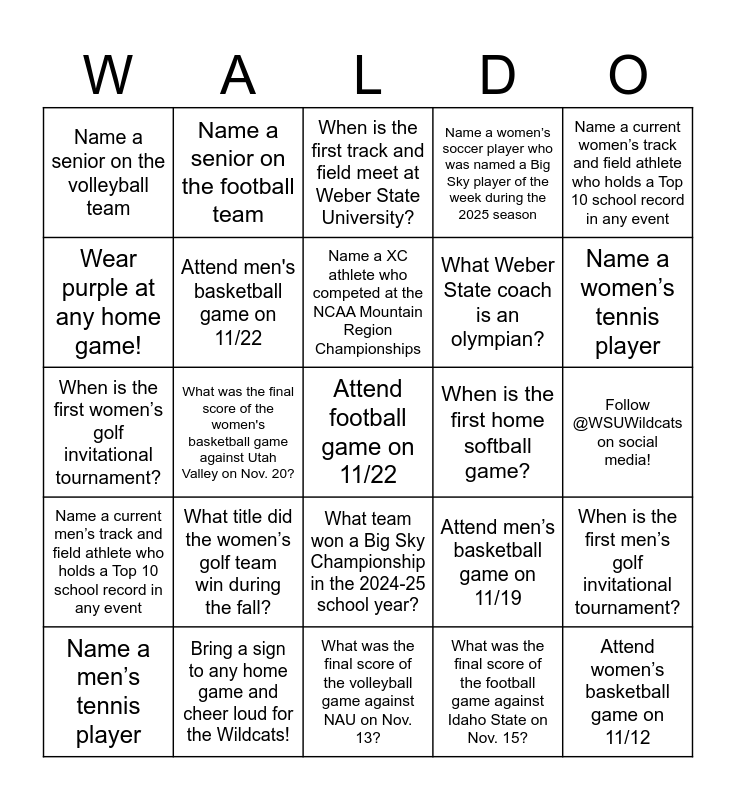 This bingo card has a free space and 26 words: Attend men’s basketball game on 11/19, Attend volleyball game on 11/19, Attend men's basketball game on 11/22, Attend women’s basketball game on 11/12, Name a senior on the volleyball team, Name a senior on the football team, Name a XC athlete who competed at the NCAA Mountain Region Championships, Name a women’s soccer player who was named a Big Sky player of the week during the 2025 season, Name a women’s tennis player, Name a men’s tennis player, What was the final score of the women's basketball game against Utah Valley on Nov. 20?, What was the final score of the volleyball game against NAU on Nov. 13?, What was the final score of the football game against Idaho State on Nov. 15?, When is the first men’s golf invitational tournament?, When is the first women’s golf invitational tournament?, When is the first track and field meet of the season?, When is the first track and field meet at Weber State University?, When is the first home softball game?, Name a current women’s track and field athlete who holds a Top 10 school record in any event, Name a current men’s track and field athlete who holds a Top 10 school record in any event, What title did the women’s golf team win during the fall?, What team won a Big Sky Championship in the 2024-25 school year?, What Weber State coach is an olympian?, Follow @WSUWildcats on social media!, Wear purple at any home game! and Bring a sign to any home game and cheer loud for the Wildcats!.