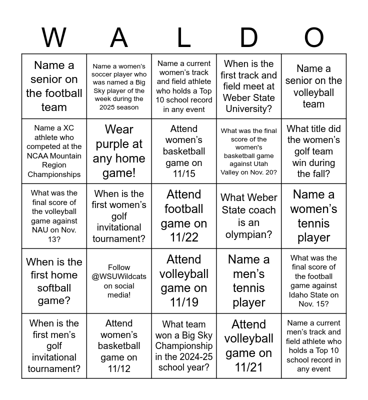 This bingo card has a free space and 26 words: Attend volleyball game on 11/19, Attend volleyball game on 11/21, Attend women’s basketball game on 11/15, Attend women’s basketball game on 11/12, Name a senior on the volleyball team, Name a senior on the football team, Name a XC athlete who competed at the NCAA Mountain Region Championships, Name a women’s soccer player who was named a Big Sky player of the week during the 2025 season, Name a women’s tennis player, Name a men’s tennis player, What was the final score of the women's basketball game against Utah Valley on Nov. 20?, What was the final score of the volleyball game against NAU on Nov. 13?, What was the final score of the football game against Idaho State on Nov. 15?, When is the first men’s golf invitational tournament?, When is the first women’s golf invitational tournament?, When is the first track and field meet of the season?, When is the first track and field meet at Weber State University?, When is the first home softball game?, Name a current women’s track and field athlete who holds a Top 10 school record in any event, Name a current men’s track and field athlete who holds a Top 10 school record in any event, What title did the women’s golf team win during the fall?, What team won a Big Sky Championship in the 2024-25 school year?, What Weber State coach is an olympian?, Follow @WSUWildcats on social media!, Wear purple at any home game! and Bring a sign to any home game and cheer loud for the Wildcats!.