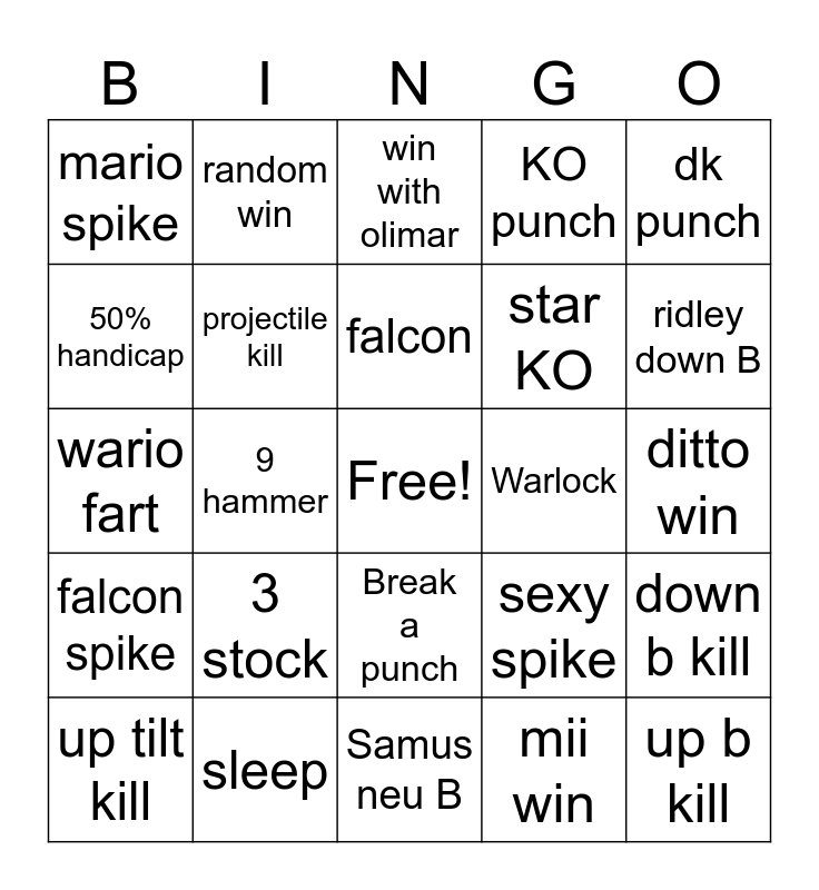 This bingo card has a free space and 24 words: 3 stock, sleep, falcon, up tilt kill, dk punch, mario spike, 50% handicap, random win, Warlock, Break a punch, star KO, wario fart, sexy spike, down b kill, projectile kill, mii win, ditto win, win with olimar, ridley down B, 9 hammer, up b kill, falcon spike, KO punch and Samus neu B.