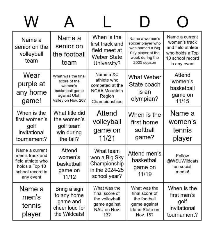 This bingo card has a free space and 26 words: Attend men’s basketball game on 11/19, Attend women’s basketball game on 11/12, Attend women’s basketball game on 11/15, Attend football game on 11/22, Name a senior on the volleyball team, Name a senior on the football team, Name a XC athlete who competed at the NCAA Mountain Region Championships, Name a women’s soccer player who was named a Big Sky player of the week during the 2025 season, Name a women’s tennis player, Name a men’s tennis player, What was the final score of the women's basketball game against Utah Valley on Nov. 20?, What was the final score of the volleyball game against NAU on Nov. 13?, What was the final score of the football game against Idaho State on Nov. 15?, When is the first men’s golf invitational tournament?, When is the first women’s golf invitational tournament?, When is the first track and field meet of the season?, When is the first track and field meet at Weber State University?, When is the first home softball game?, Name a current women’s track and field athlete who holds a Top 10 school record in any event, Name a current men’s track and field athlete who holds a Top 10 school record in any event, What title did the women’s golf team win during the fall?, What team won a Big Sky Championship in the 2024-25 school year?, What Weber State coach is an olympian?, Follow @WSUWildcats on social media!, Wear purple at any home game! and Bring a sign to any home game and cheer loud for the Wildcats!.