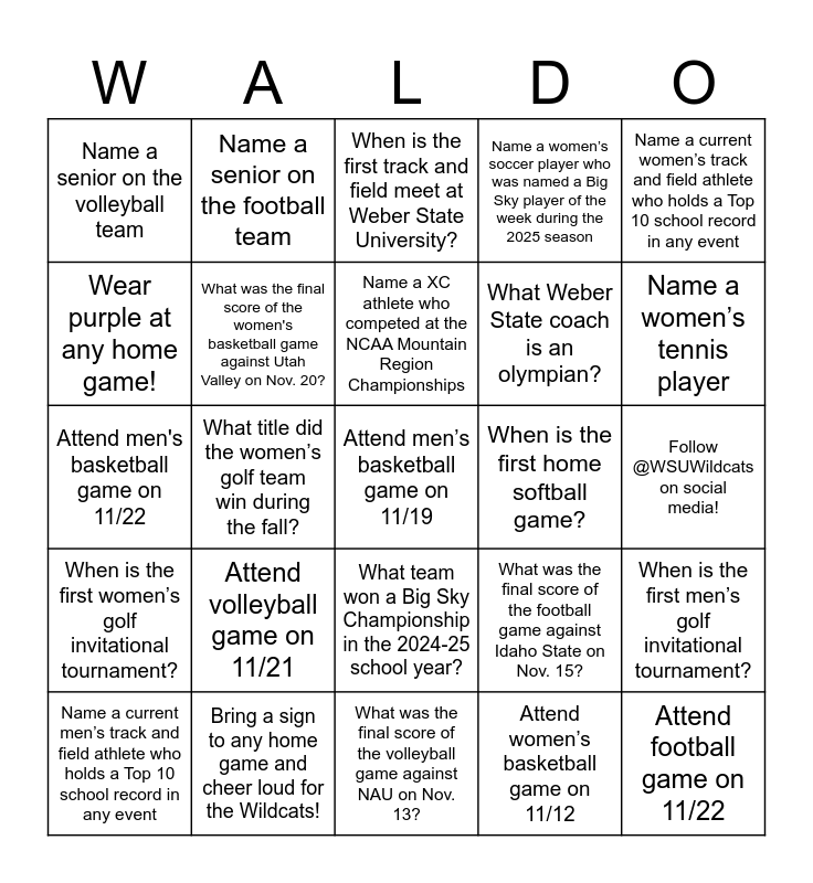 This bingo card has a free space and 26 words: Attend volleyball game on 11/21, Attend women’s basketball game on 11/12, Attend men's basketball game on 11/22, Attend football game on 11/22, Name a senior on the volleyball team, Name a senior on the football team, Name a XC athlete who competed at the NCAA Mountain Region Championships, Name a women’s soccer player who was named a Big Sky player of the week during the 2025 season, Name a women’s tennis player, Name a men’s tennis player, What was the final score of the women's basketball game against Utah Valley on Nov. 20?, What was the final score of the volleyball game against NAU on Nov. 13?, What was the final score of the football game against Idaho State on Nov. 15?, When is the first men’s golf invitational tournament?, When is the first women’s golf invitational tournament?, When is the first track and field meet of the season?, When is the first track and field meet at Weber State University?, When is the first home softball game?, Name a current women’s track and field athlete who holds a Top 10 school record in any event, Name a current men’s track and field athlete who holds a Top 10 school record in any event, What title did the women’s golf team win during the fall?, What team won a Big Sky Championship in the 2024-25 school year?, What Weber State coach is an olympian?, Follow @WSUWildcats on social media!, Wear purple at any home game! and Bring a sign to any home game and cheer loud for the Wildcats!.