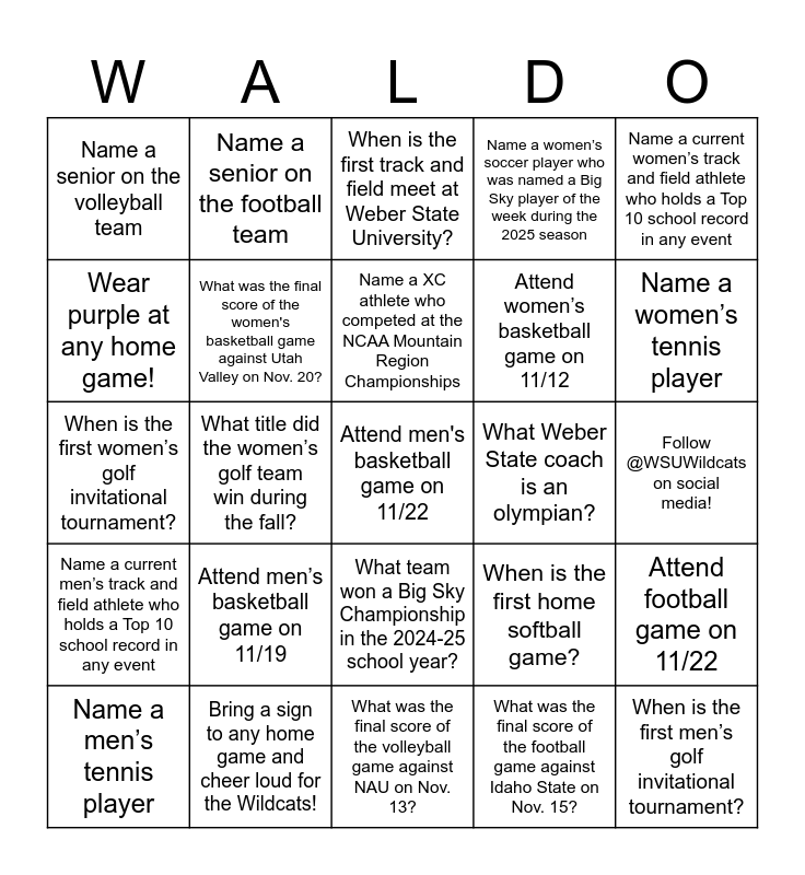 This bingo card has a free space and 26 words: Attend football game on 11/22, Attend men’s basketball game on 11/19, Attend women’s basketball game on 11/12, Attend volleyball game on 11/19, Name a senior on the volleyball team, Name a senior on the football team, Name a XC athlete who competed at the NCAA Mountain Region Championships, Name a women’s soccer player who was named a Big Sky player of the week during the 2025 season, Name a women’s tennis player, Name a men’s tennis player, What was the final score of the women's basketball game against Utah Valley on Nov. 20?, What was the final score of the volleyball game against NAU on Nov. 13?, What was the final score of the football game against Idaho State on Nov. 15?, When is the first men’s golf invitational tournament?, When is the first women’s golf invitational tournament?, When is the first track and field meet of the season?, When is the first track and field meet at Weber State University?, When is the first home softball game?, Name a current women’s track and field athlete who holds a Top 10 school record in any event, Name a current men’s track and field athlete who holds a Top 10 school record in any event, What title did the women’s golf team win during the fall?, What team won a Big Sky Championship in the 2024-25 school year?, What Weber State coach is an olympian?, Follow @WSUWildcats on social media!, Wear purple at any home game! and Bring a sign to any home game and cheer loud for the Wildcats!.