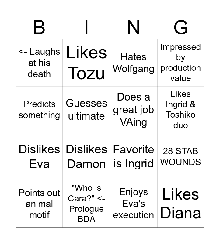This bingo card has 16 words: "Who is Cara?" <- Prologue BDA, 28 STAB WOUNDS, Hates Wolfgang, <- Laughs at his death, Dislikes Eva, Likes Tozu, Favorite is Ingrid, Enjoys Eva's execution, Predicts something, Guesses ultimate, Points out animal motif, Impressed by production value, Dislikes Damon, Likes Ingrid & Toshiko duo, Does a great job VAing and Likes Diana.