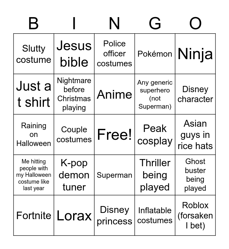 This bingo card has a free space and 24 words: K-pop demon tuner, Lorax, Anime, Fortnite, Ninja, Slutty costume, Just a t shirt, Jesus bible, Peak cosplay, Superman, Any generic superhero (not Superman), Raining on Halloween, Thriller being played, Ghost buster being played, Nightmare before Christmas playing, Inflatable costumes, Asian guys in rice hats, Police officer costumes, Disney character, Couple costumes, Roblox (forsaken I bet), Me hitting people with my Halloween costume like last year, Pokémon and Disney princess.