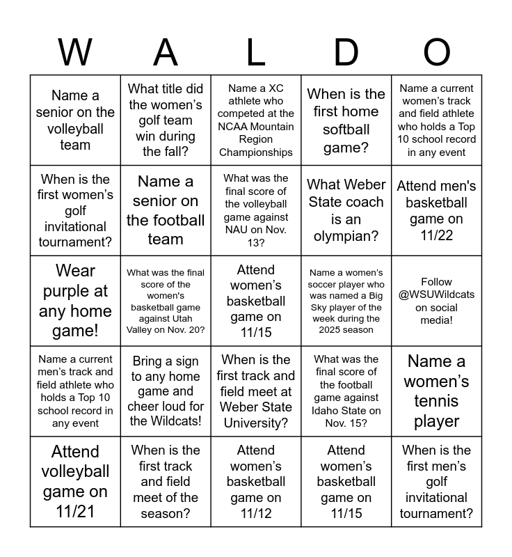 This bingo card has a free space and 28 words: Attend volleyball game on 11/21, Attend women’s basketball game on 11/15, Attend men's basketball game on 11/22, Attend football game on 11/22, Name a senior on the volleyball team, Name a senior on the football team, Name a XC athlete who competed at the NCAA Mountain Region Championships, Name a women’s soccer player who was named a Big Sky player of the week during the 2025 season, Name a women’s tennis player, Name a men’s tennis player, What was the final score of the women's basketball game against Utah Valley on Nov. 20?, What was the final score of the volleyball game against NAU on Nov. 13?, What was the final score of the football game against Idaho State on Nov. 15?, When is the first men’s golf invitational tournament?, When is the first women’s golf invitational tournament?, When is the first track and field meet of the season?, When is the first track and field meet at Weber State University?, When is the first home softball game?, Name a current women’s track and field athlete who holds a Top 10 school record in any event, Name a current men’s track and field athlete who holds a Top 10 school record in any event, What title did the women’s golf team win during the fall?, What team won a Big Sky Championship in the 2024-25 school year?, What Weber State coach is an olympian?, Follow @WSUWildcats on social media!, Wear purple at any home game!, Bring a sign to any home game and cheer loud for the Wildcats!, Attend women’s basketball game on 11/12 and Attend men’s basketball game on 11/19.
