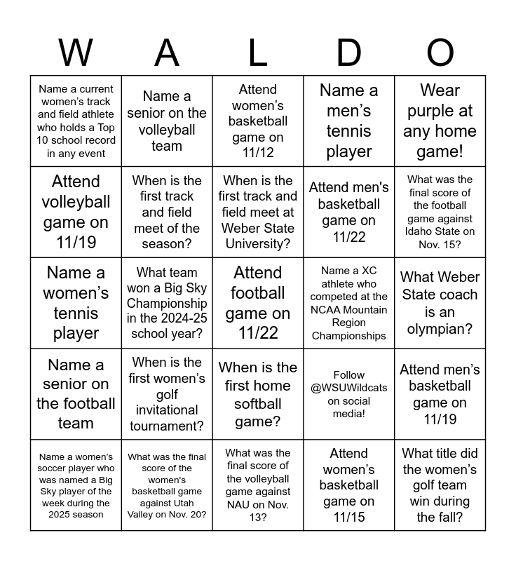 This bingo card has a free space and 28 words: Attend men’s basketball game on 11/19, Attend volleyball game on 11/21, Attend men's basketball game on 11/22, Attend women’s basketball game on 11/15, Attend volleyball game on 11/19, Attend women’s basketball game on 11/12, Name a senior on the volleyball team, Name a senior on the football team, Name a XC athlete who competed at the NCAA Mountain Region Championships, Name a women’s soccer player who was named a Big Sky player of the week during the 2025 season, Name a women’s tennis player, Name a men’s tennis player, What was the final score of the women's basketball game against Utah Valley on Nov. 20?, What was the final score of the volleyball game against NAU on Nov. 13?, What was the final score of the football game against Idaho State on Nov. 15?, When is the first men’s golf invitational tournament?, When is the first women’s golf invitational tournament?, When is the first track and field meet of the season?, When is the first track and field meet at Weber State University?, When is the first home softball game?, Name a current women’s track and field athlete who holds a Top 10 school record in any event, Name a current men’s track and field athlete who holds a Top 10 school record in any event, What title did the women’s golf team win during the fall?, What team won a Big Sky Championship in the 2024-25 school year?, What Weber State coach is an olympian?, Follow @WSUWildcats on social media!, Wear purple at any home game! and Bring a sign to any home game and cheer loud for the Wildcats!.
