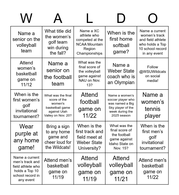 This bingo card has a free space and 28 words: Attend men’s basketball game on 11/19, Attend volleyball game on 11/21, Attend women’s basketball game on 11/12, Attend men's basketball game on 11/22, Name a senior on the volleyball team, Name a senior on the football team, Name a XC athlete who competed at the NCAA Mountain Region Championships, Name a women’s soccer player who was named a Big Sky player of the week during the 2025 season, Name a women’s tennis player, Name a men’s tennis player, What was the final score of the women's basketball game against Utah Valley on Nov. 20?, What was the final score of the volleyball game against NAU on Nov. 13?, What was the final score of the football game against Idaho State on Nov. 15?, When is the first men’s golf invitational tournament?, When is the first women’s golf invitational tournament?, When is the first track and field meet of the season?, When is the first track and field meet at Weber State University?, When is the first home softball game?, Name a current women’s track and field athlete who holds a Top 10 school record in any event, Name a current men’s track and field athlete who holds a Top 10 school record in any event, What title did the women’s golf team win during the fall?, What team won a Big Sky Championship in the 2024-25 school year?, Name a Weber State coach who is an Olympian, Follow @WSUWildcats on social media!, Wear purple at any home game!, Bring a sign to any home game and cheer loud for the Wildcats!, Attend volleyball game on 11/19 and Attend women’s basketball game on 11/15.