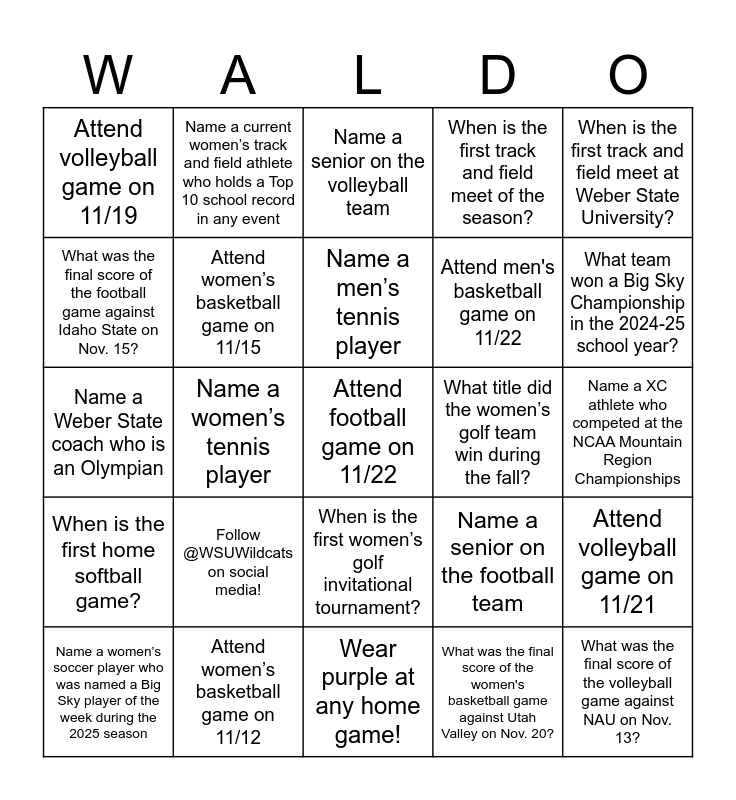 This bingo card has a free space and 28 words: Attend volleyball game on 11/21, Attend men’s basketball game on 11/19, Attend men's basketball game on 11/22, Attend women’s basketball game on 11/12, Attend volleyball game on 11/19, Attend women’s basketball game on 11/15, Name a senior on the volleyball team, Name a senior on the football team, Name a XC athlete who competed at the NCAA Mountain Region Championships, Name a women’s soccer player who was named a Big Sky player of the week during the 2025 season, Name a women’s tennis player, Name a men’s tennis player, What was the final score of the women's basketball game against Utah Valley on Nov. 20?, What was the final score of the volleyball game against NAU on Nov. 13?, What was the final score of the football game against Idaho State on Nov. 15?, When is the first men’s golf invitational tournament?, When is the first women’s golf invitational tournament?, When is the first track and field meet of the season?, When is the first track and field meet at Weber State University?, When is the first home softball game?, Name a current women’s track and field athlete who holds a Top 10 school record in any event, Name a current men’s track and field athlete who holds a Top 10 school record in any event, What title did the women’s golf team win during the fall?, What team won a Big Sky Championship in the 2024-25 school year?, Name a Weber State coach who is an Olympian, Follow @WSUWildcats on social media!, Wear purple at any home game! and Bring a sign to any home game and cheer loud for the Wildcats!.