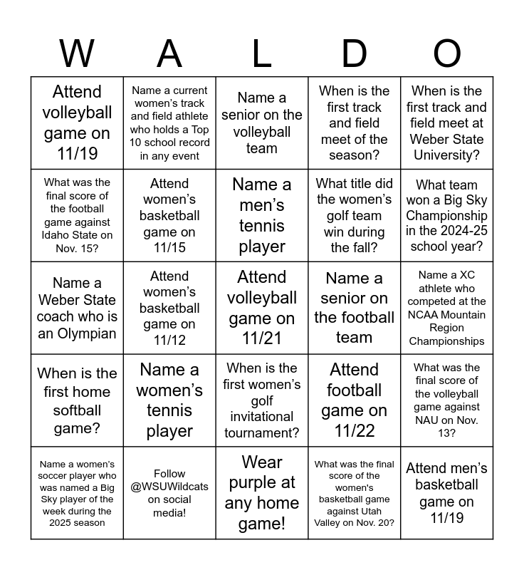 This bingo card has a free space and 28 words: Attend football game on 11/22, Attend men’s basketball game on 11/19, Attend women’s basketball game on 11/12, Attend men's basketball game on 11/22, Attend volleyball game on 11/19, Attend women’s basketball game on 11/15, Name a senior on the volleyball team, Name a senior on the football team, Name a XC athlete who competed at the NCAA Mountain Region Championships, Name a women’s soccer player who was named a Big Sky player of the week during the 2025 season, Name a women’s tennis player, Name a men’s tennis player, What was the final score of the women's basketball game against Utah Valley on Nov. 20?, What was the final score of the volleyball game against NAU on Nov. 13?, What was the final score of the football game against Idaho State on Nov. 15?, When is the first men’s golf invitational tournament?, When is the first women’s golf invitational tournament?, When is the first track and field meet of the season?, When is the first track and field meet at Weber State University?, When is the first home softball game?, Name a current women’s track and field athlete who holds a Top 10 school record in any event, Name a current men’s track and field athlete who holds a Top 10 school record in any event, What title did the women’s golf team win during the fall?, What team won a Big Sky Championship in the 2024-25 school year?, Name a Weber State coach who is an Olympian, Follow @WSUWildcats on social media!, Wear purple at any home game! and Bring a sign to any home game and cheer loud for the Wildcats!.