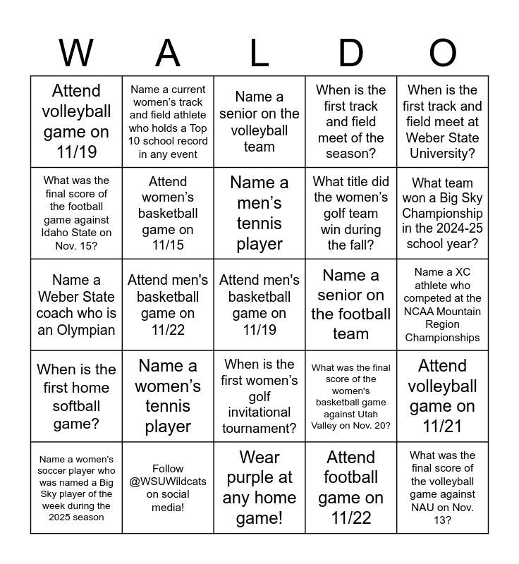 This bingo card has a free space and 28 words: Attend volleyball game on 11/21, Attend football game on 11/22, Attend men's basketball game on 11/22, Attend women’s basketball game on 11/12, Attend volleyball game on 11/19, Attend women’s basketball game on 11/15, Name a senior on the volleyball team, Name a senior on the football team, Name a XC athlete who competed at the NCAA Mountain Region Championships, Name a women’s soccer player who was named a Big Sky player of the week during the 2025 season, Name a women’s tennis player, Name a men’s tennis player, What was the final score of the women's basketball game against Utah Valley on Nov. 20?, What was the final score of the volleyball game against NAU on Nov. 13?, What was the final score of the football game against Idaho State on Nov. 15?, When is the first men’s golf invitational tournament?, When is the first women’s golf invitational tournament?, When is the first track and field meet of the season?, When is the first track and field meet at Weber State University?, When is the first home softball game?, Name a current women’s track and field athlete who holds a Top 10 school record in any event, Name a current men’s track and field athlete who holds a Top 10 school record in any event, What title did the women’s golf team win during the fall?, What team won a Big Sky Championship in the 2024-25 school year?, Name a Weber State coach who is an Olympian, Follow @WSUWildcats on social media!, Wear purple at any home game! and Bring a sign to any home game and cheer loud for the Wildcats!.