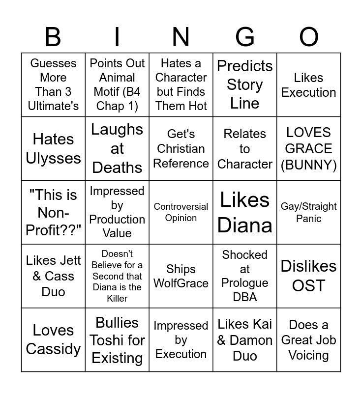 This bingo card has a free space and 24 words: Loves Cassidy, Doesn't Believe for a Second that Diana is the Killer, Get's Christian Reference, Likes Kai & Damon Duo, Likes Execution, Guesses More Than 3 Ultimate's, Points Out Animal Motif (B4 Chap 1), Hates a Character but Finds Them Hot, Likes Diana, Gay/Straight Panic, "This is Non-Profit??", Laughs at Deaths, Shocked at Prologue DBA, Dislikes OST, Hates Ulysses, Bullies Toshi for Existing, Impressed by Execution, Predicts Story Line, LOVES GRACE (BUNNY), Likes Jett & Cass Duo, Impressed by Production Value, Ships WolfGrace, Relates to Character and Does a Great Job Voicing.