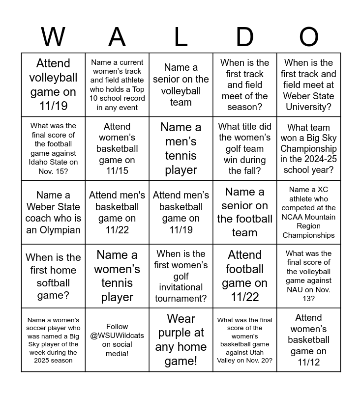 This bingo card has a free space and 28 words: Attend football game on 11/22, Attend volleyball game on 11/21, Attend men's basketball game on 11/22, Attend women’s basketball game on 11/12, Attend volleyball game on 11/19, Attend women’s basketball game on 11/15, Name a senior on the volleyball team, Name a senior on the football team, Name a XC athlete who competed at the NCAA Mountain Region Championships, Name a women’s soccer player who was named a Big Sky player of the week during the 2025 season, Name a women’s tennis player, Name a men’s tennis player, What was the final score of the women's basketball game against Utah Valley on Nov. 20?, What was the final score of the volleyball game against NAU on Nov. 13?, What was the final score of the football game against Idaho State on Nov. 15?, When is the first men’s golf invitational tournament?, When is the first women’s golf invitational tournament?, When is the first track and field meet of the season?, When is the first track and field meet at Weber State University?, When is the first home softball game?, Name a current women’s track and field athlete who holds a Top 10 school record in any event, Name a current men’s track and field athlete who holds a Top 10 school record in any event, What title did the women’s golf team win during the fall?, What team won a Big Sky Championship in the 2024-25 school year?, Name a Weber State coach who is an Olympian, Follow @WSUWildcats on social media!, Wear purple at any home game! and Bring a sign to any home game and cheer loud for the Wildcats!.