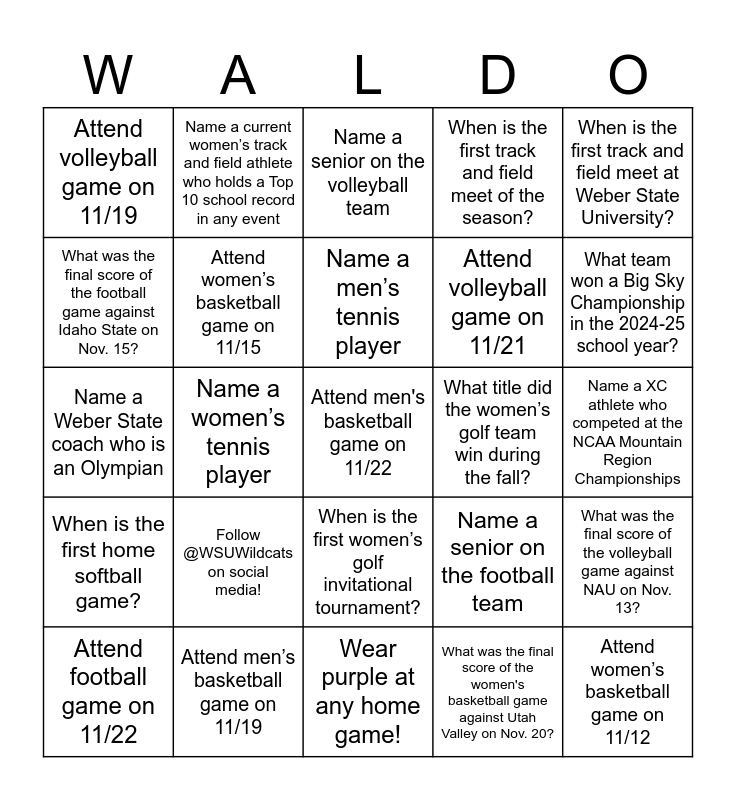 This bingo card has a free space and 28 words: Attend football game on 11/22, Attend women’s basketball game on 11/12, Attend volleyball game on 11/21, Attend men’s basketball game on 11/19, Attend volleyball game on 11/19, Attend women’s basketball game on 11/15, Name a senior on the volleyball team, Name a senior on the football team, Name a XC athlete who competed at the NCAA Mountain Region Championships, Name a women’s soccer player who was named a Big Sky player of the week during the 2025 season, Name a women’s tennis player, Name a men’s tennis player, What was the final score of the women's basketball game against Utah Valley on Nov. 20?, What was the final score of the volleyball game against NAU on Nov. 13?, What was the final score of the football game against Idaho State on Nov. 15?, When is the first men’s golf invitational tournament?, When is the first women’s golf invitational tournament?, When is the first track and field meet of the season?, When is the first track and field meet at Weber State University?, When is the first home softball game?, Name a current women’s track and field athlete who holds a Top 10 school record in any event, Name a current men’s track and field athlete who holds a Top 10 school record in any event, What title did the women’s golf team win during the fall?, What team won a Big Sky Championship in the 2024-25 school year?, Name a Weber State coach who is an Olympian, Follow @WSUWildcats on social media!, Wear purple at any home game! and Bring a sign to any home game and cheer loud for the Wildcats!.