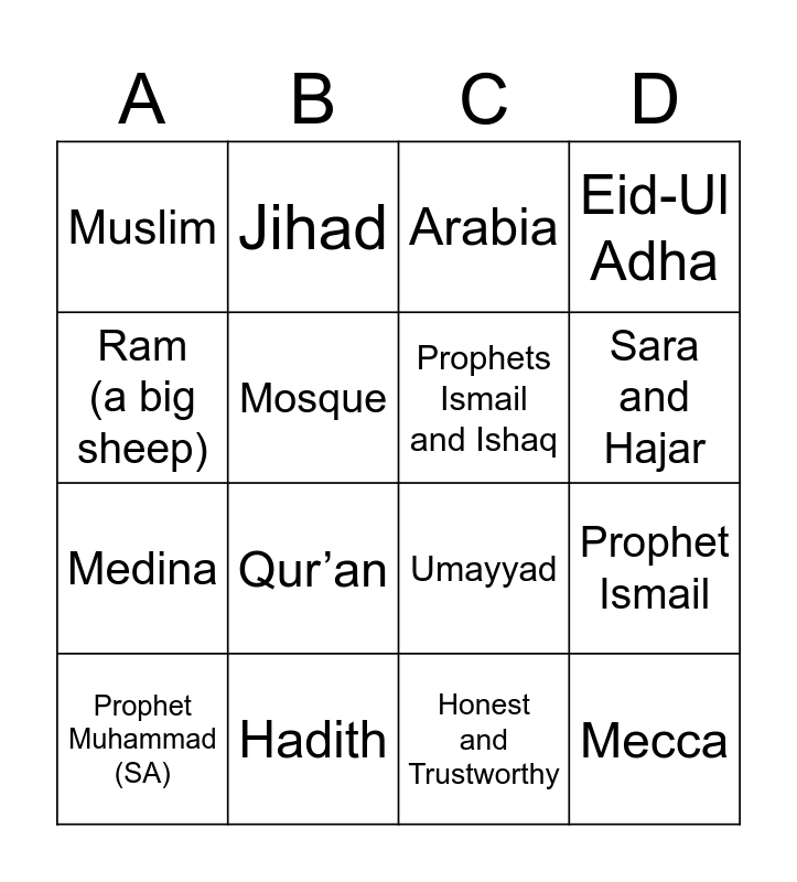 This bingo card has 39 words: Gets messages from God, No one knows, Ur Iraq, Prophets Ismail and Ishaq, Safa and Marwa, Zam Zam, Sara and Hajar, The Ka'bah, Ram (a big sheep), Mecca, Prophet Ismail, Eid-Ul Adha, Prophet Muhammad (SA), Honest and Trustworthy, Hadith, Qur'an, Islam, Muslim, Muhammad, Prophet, Mosque, Mecca, Medina, Qur’an, Caliph, Five Pillars of Islam, Monotheism, Polytheism, Hijrah, Jihad, Hajj, Sharia, Arabia, Bedouin, Kaaba, Sunni, Shia, Umayyad and Abbasid.
