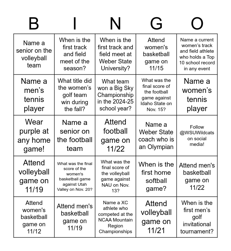 This bingo card has a free space and 28 words: Attend volleyball game on 11/21, Attend men's basketball game on 11/19, Attend women's basketball game on 11/12, Attend men's basketball game on 11/22, Attend volleyball game on 11/19, Attend women's basketball game on 11/15, Name a senior on the volleyball team, Name a senior on the football team, Name a XC athlete who competed at the NCAA Mountain Region Championships, Name a women’s soccer player who was named a Big Sky player of the week during the 2025 season, Name a women’s tennis player, Name a men’s tennis player, What was the final score of the women's basketball game against Utah Valley on Nov. 20?, What was the final score of the volleyball game against NAU on Nov. 13?, What was the final score of the football game against Idaho State on Nov. 15?, When is the first men’s golf invitational tournament?, When is the first women’s golf invitational tournament?, When is the first track and field meet of the season?, When is the first track and field meet at Weber State University?, When is the first home softball game?, Name a current women’s track and field athlete who holds a Top 10 school record in any event, Name a current men’s track and field athlete who holds a Top 10 school record in any event, What title did the women’s golf team win during the fall?, What team won a Big Sky Championship in the 2024-25 school year?, Name a Weber State coach who is an Olympian, Follow @WSUWildcats on social media!, Wear purple at any home game! and Bring a sign to any home game and cheer loud for the Wildcats!.