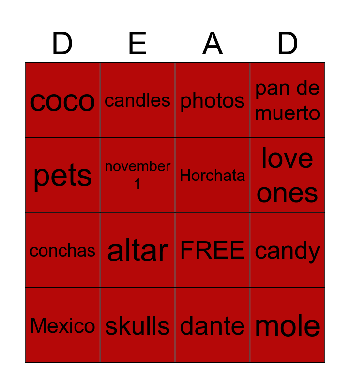 This bingo card has 16 words: skulls, candy, photos, coco, conchas, candles, FREE, dante, pets, november 1, Mexico, pan de muerto, altar, love ones, Horchata and mole.