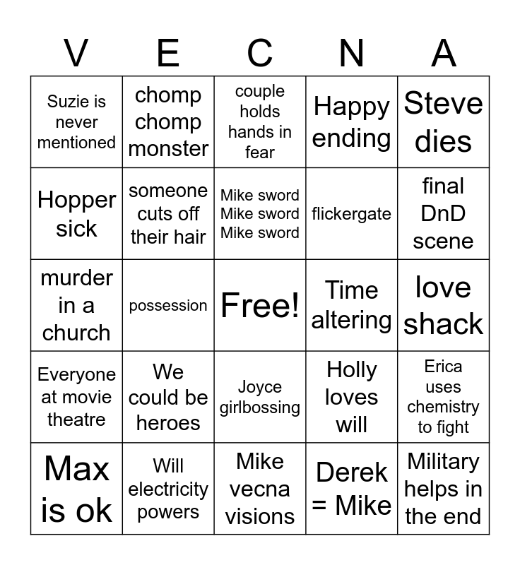 This bingo card has a free space and 24 words: We could be heroes, Will electricity powers, Mike sword Mike sword Mike sword, Max is ok, Steve dies, Suzie is never mentioned, Hopper sick, chomp chomp monster, Time altering, Joyce girlbossing, flickergate, murder in a church, Holly loves will, Erica uses chemistry to fight, someone cuts off their hair, Derek = Mike, love shack, couple holds hands in fear, final DnD scene, possession, Military helps in the end, Everyone at movie theatre, Happy ending and Mike vecna visions.