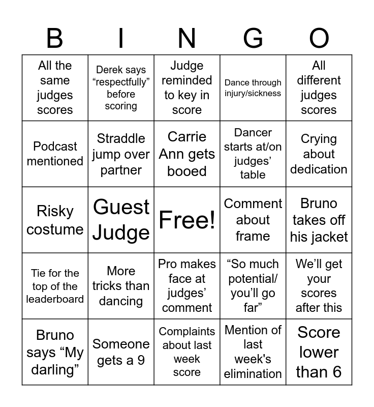 This bingo card has a free space and 25 words: More tricks than dancing, Complaints about last week score, Carrie Ann gets booed, Bruno says “My darling”, All different judges scores, All the same judges scores, Podcast mentioned, Derek says “respectfully” before scoring, Comment about frame, Pro makes face at judges’ comment, Dancer starts at/on judges’ table, Risky costume, “So much potential/ you’ll go far”, We’ll get your scores after this, Straddle jump over partner, Dance mistake by pro or celeb, Bruno takes off his jacket, Judge reminded to key in score, Crying about dedication, Guest Judge, Score lower than 6, Someone gets a 9, Tie for the top of the leaderboard, Dance through injury/sickness and Mention of last week's elimination.