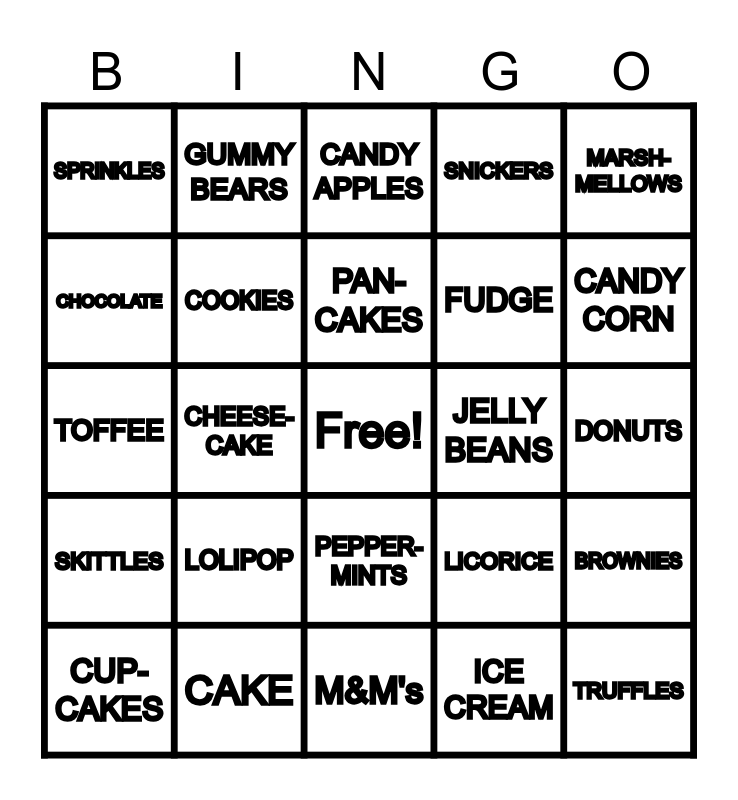 This bingo card has a free space and 24 words: LOLIPOP, CAKE, PAN-CAKES, CUP-CAKES, MARSH-MELLOWS, SPRINKLES, CHOCOLATE, GUMMY BEARS, JELLY BEANS, PEPPER-MINTS, FUDGE, TOFFEE, LICORICE, BROWNIES, COOKIES, ICE CREAM, DONUTS, CANDY APPLES, CANDY CORN, CHEESE- CAKE, TRUFFLES, SKITTLES, SNICKERS and M&M's.